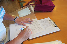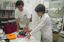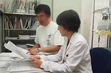 研修を終えたスタッフと患者さまについて確認をしながら、資料や書籍を準備します。