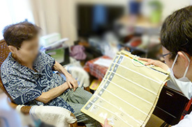 お顔を見ながら「お薬、異常ないですか」とか、「今日は暑いですね」などと声をかけて、話しやすい雰囲気になるようにしています。「今日は何曜日ですかね」と問いかけながら、残薬の確認をしたり、服薬の様子を確認しています。