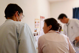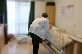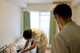 ドクター、介護士さんと一緒に居室へ入り、後ろから見守りながら、情報を記録していきます。たくさんの居室をまわるので、往診はとてもスピーディ。