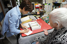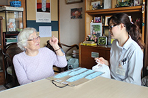 お薬ボードをチェック。今朝までの薬が忘れずに服用されているのを確認し、体調を伺います。薬のことのみではなく、生活の悩みについてもしっかり聞き取りし、問題が見つかれば医師やケアマネージャーさんに報告します。