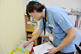 店舗によりまちまちですが、個人宅だと90軒ほどです。施設は3施設です。患者様の症状、処方期間等により訪問頻度は変わりますが、平均すると2週間に1度は訪問しています。患者様が薬の服用が安定していなケースもありますので、1週間に1度、ほぼ毎日訪問することも時にはあります。店舗にいる時間は少なく、ほぼ毎日訪問活動をしていますよ。薬の鑑査時や準備は店舗にいますが、外来受付のスタッフも協力して準備をしてくれているので助かってます。
